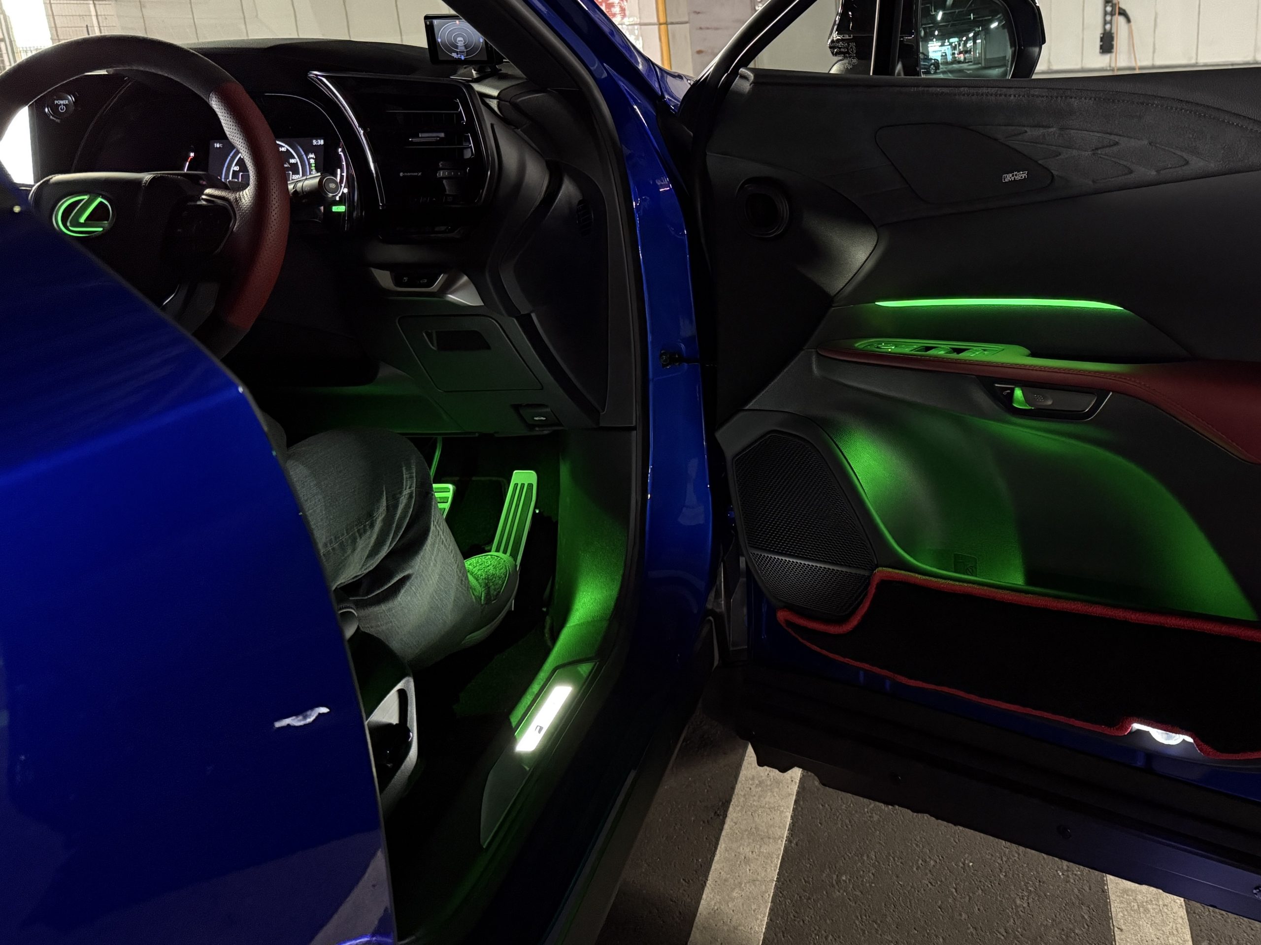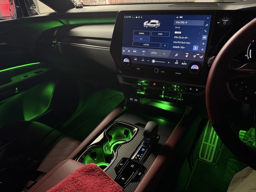 併せて底面照射のドアポケットイルミVer.2と、ステアリングエンブレムイルミのマルチカラー化、レザー貼り化を実施。