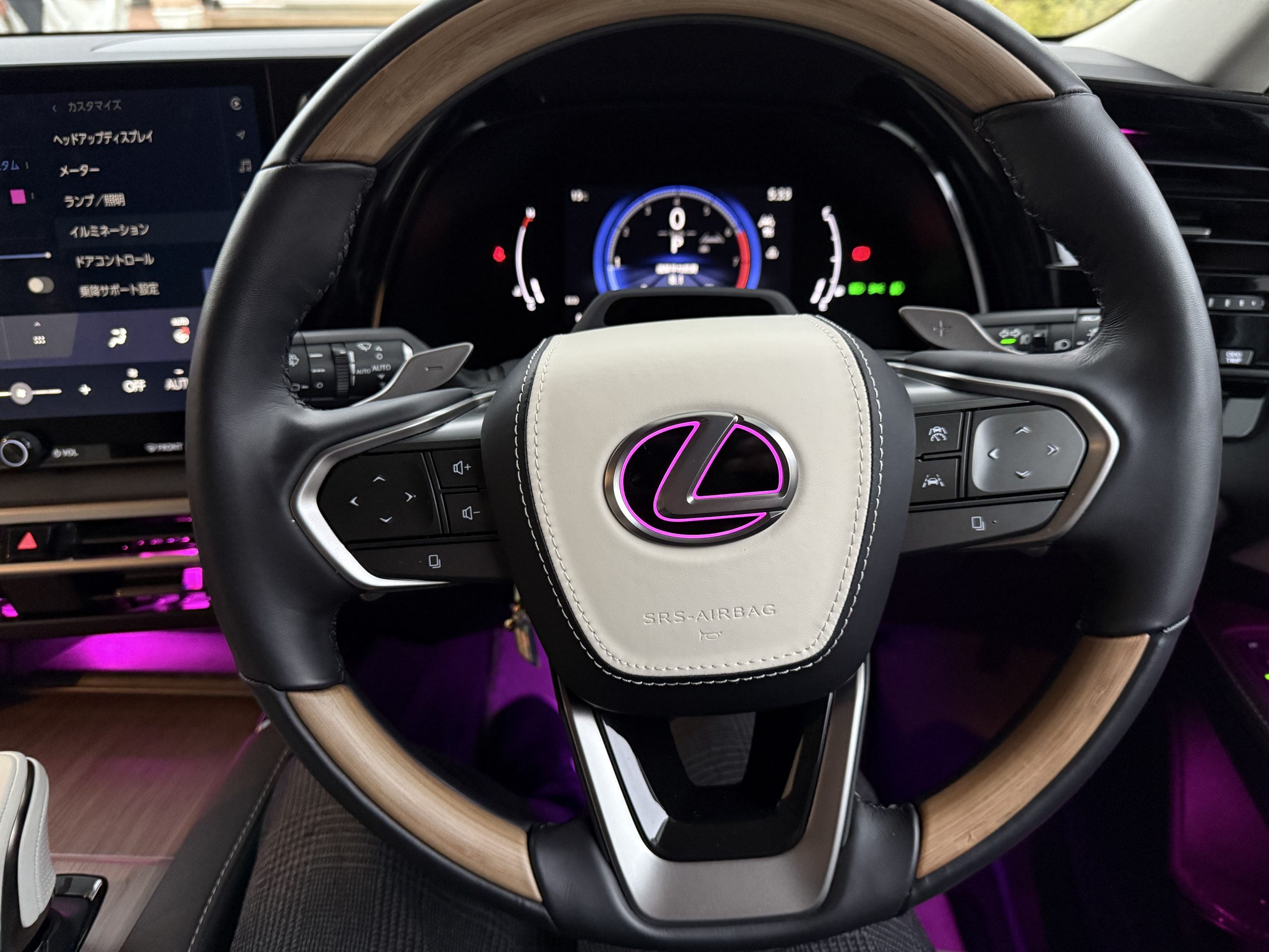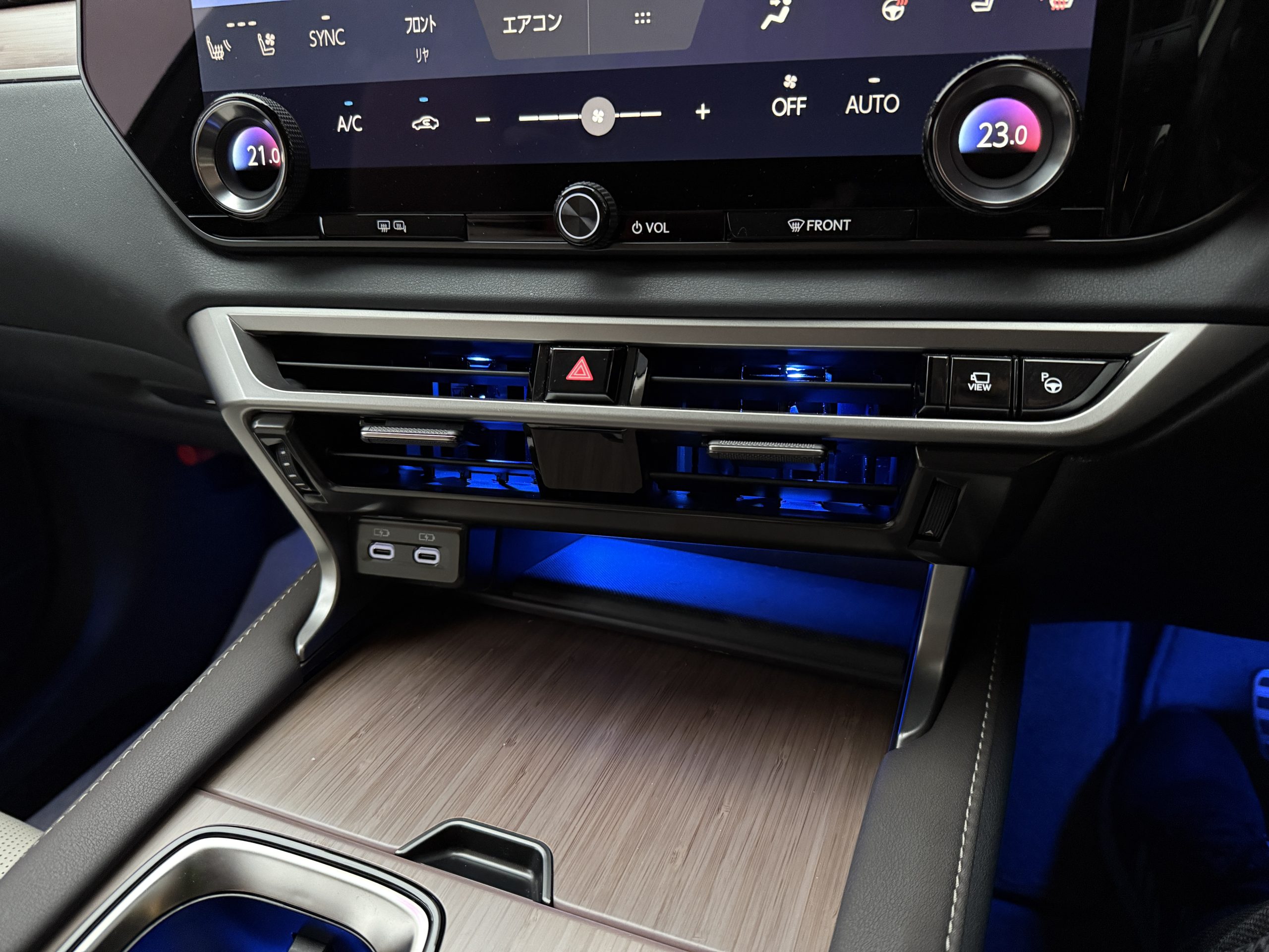 ステアリングエンブレムイルミと社外フットライトの色味調整、センタートレイのライン化を施工しました。