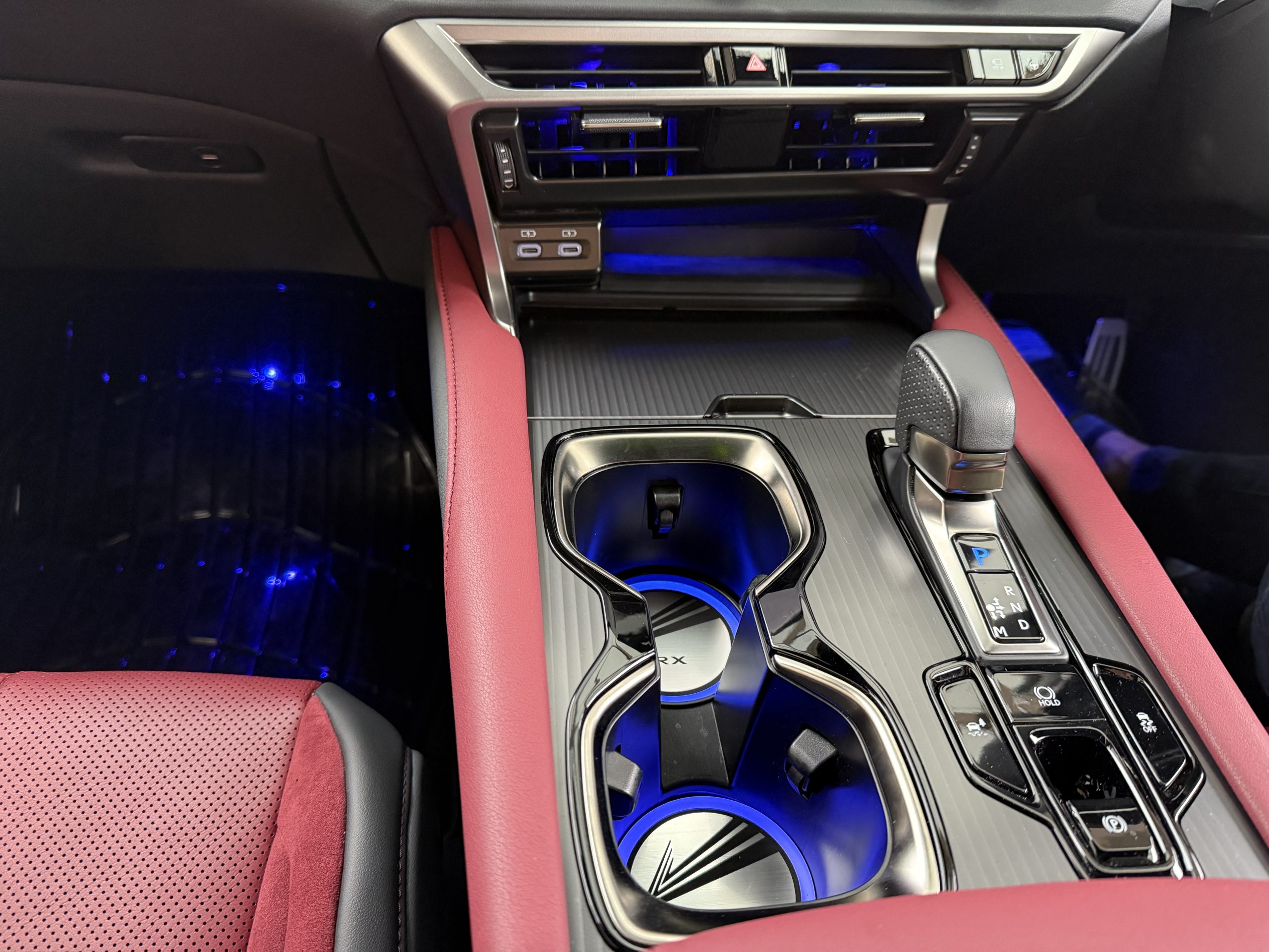 レクサスRXのアンビエント光量アップと増設をさせていただきました。・カップホルダーイルミ・センタートレイイルミ・サイドドアイルミ・レジスターイルミ・ドアポケットイルミVer.2・後席フットイルミ・光量アップ